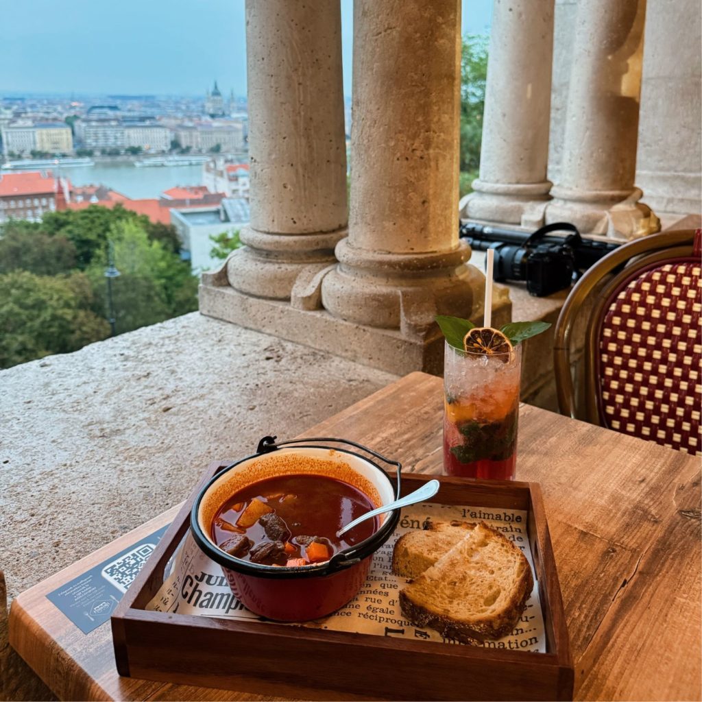 ドナウ川沿いのカフェバー。大きな窓から国会議事堂や川の夜景を眺められます。ここではカフェの軽食からディナーにおすすめのハンガリー名物「グヤーシュ」を頂けます!