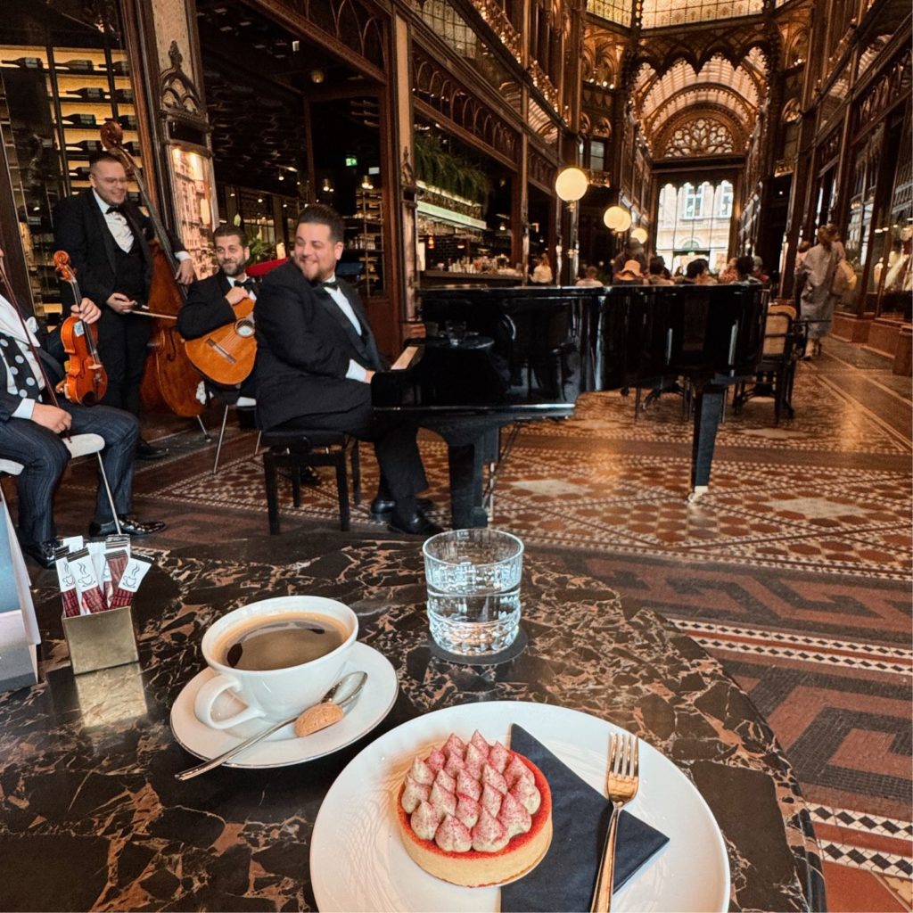 重厚感ある内装のカフェでコーヒー休憩。最後にゆったりと過ごすのに最適。