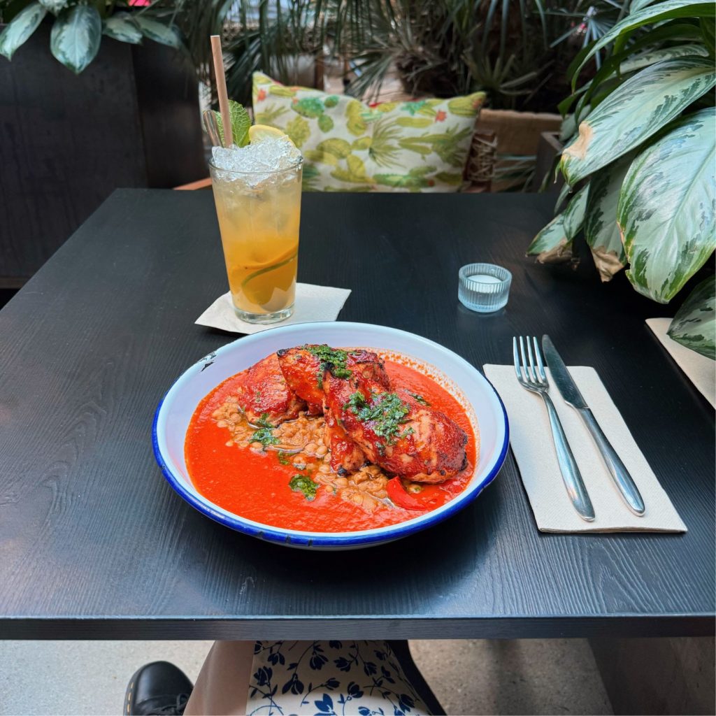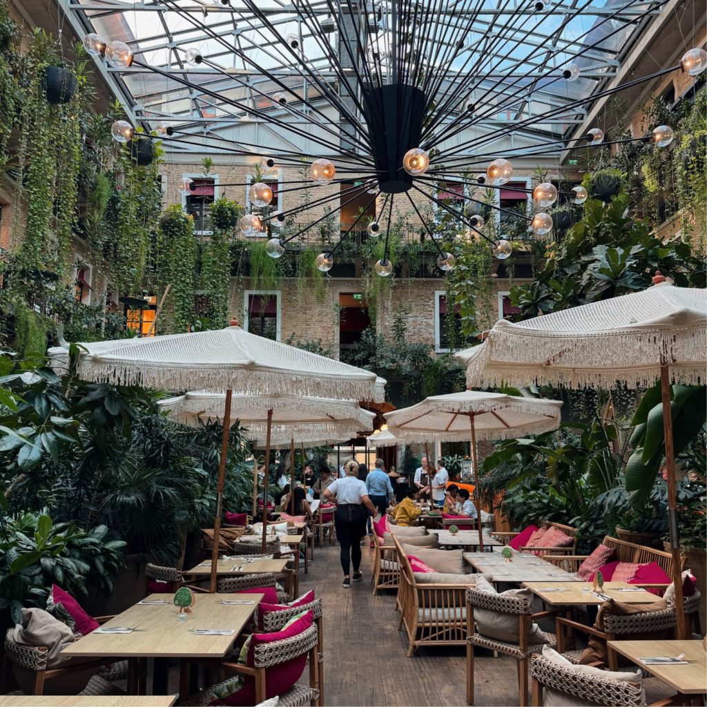植物に囲まれたおしゃれなレストラン。料理も内装も洗練されていて人気。
