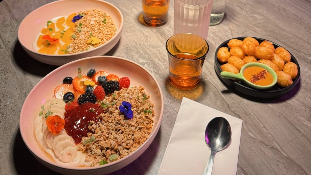 ロンドン中心地にあるカフェ。レトロでスタイリッシュな雰囲気の店内は、ブランチにもディナーにもぴったりです。私たちはシリアルをいただいたのですが、トッピングのフルーツやナッツがたっぷりで、見た目も華やか。ほどよい甘さで元気になれる一皿でした。カフェメニューだけでなく、しっかり食事ができるフードメニューも揃っているので、その日の気分に合わせて楽しめるのも魅力。おしゃれで落ち着いた空間で、ゆっくり過ごしたい方におすすめの一軒。